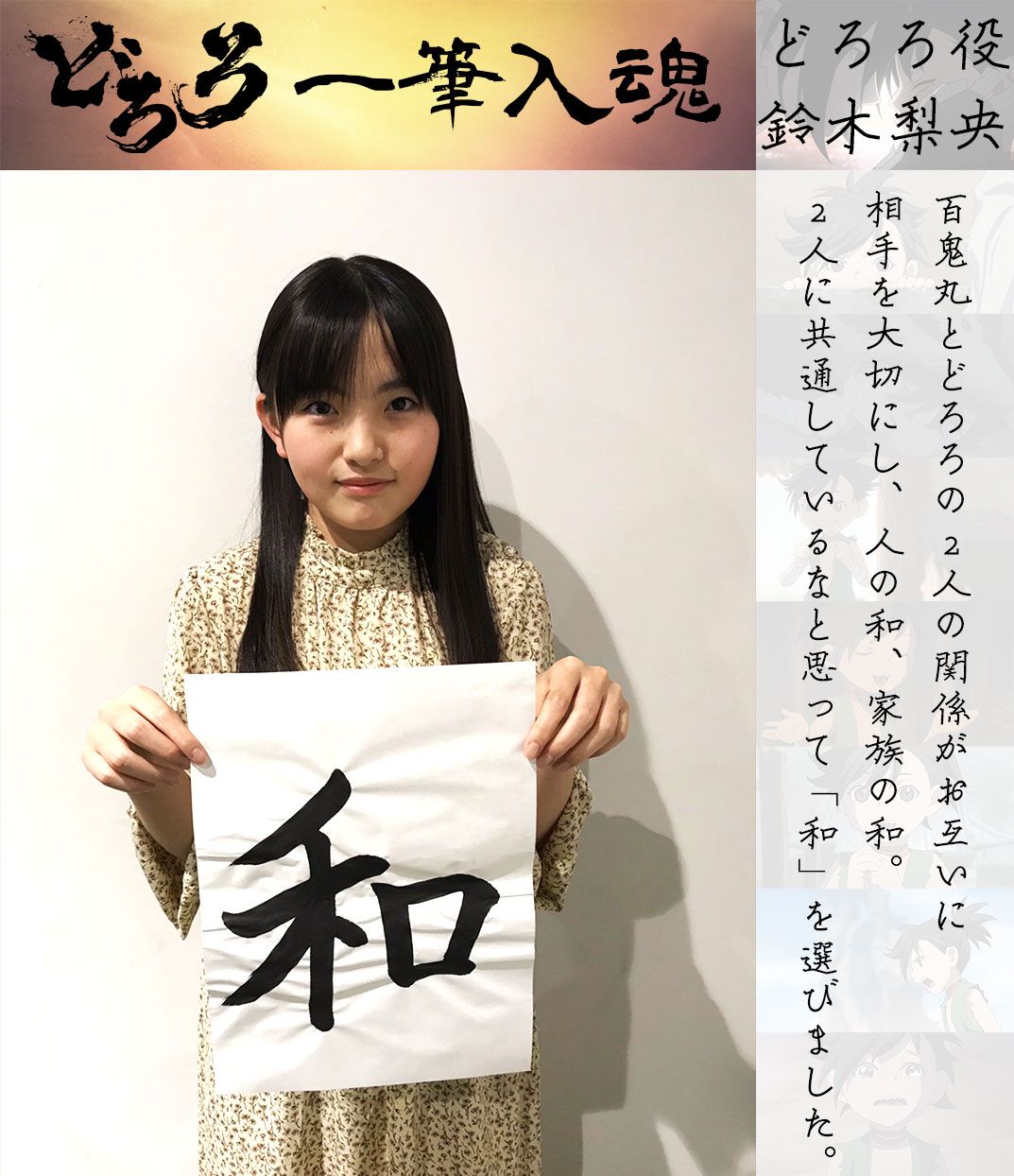 Twitter 上的 Tvアニメ どろろ 公式 どろろ 一筆入魂 それぞれの思う どろろ とは をテーマに一筆頂きました 本日はどろろ役を担当されている 鈴木梨央 さんです どろろと百鬼丸 2人の関係性を 和 という漢字で表現していただきました
